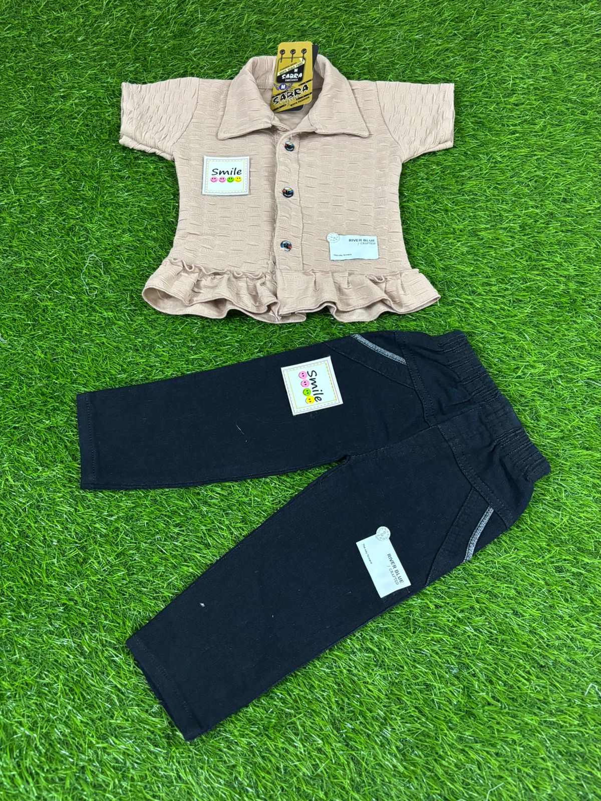 Trendy Girls Beige Ruffle Hem Shirt with Black Pant Set Of 6 Pieces[3 COLOR]