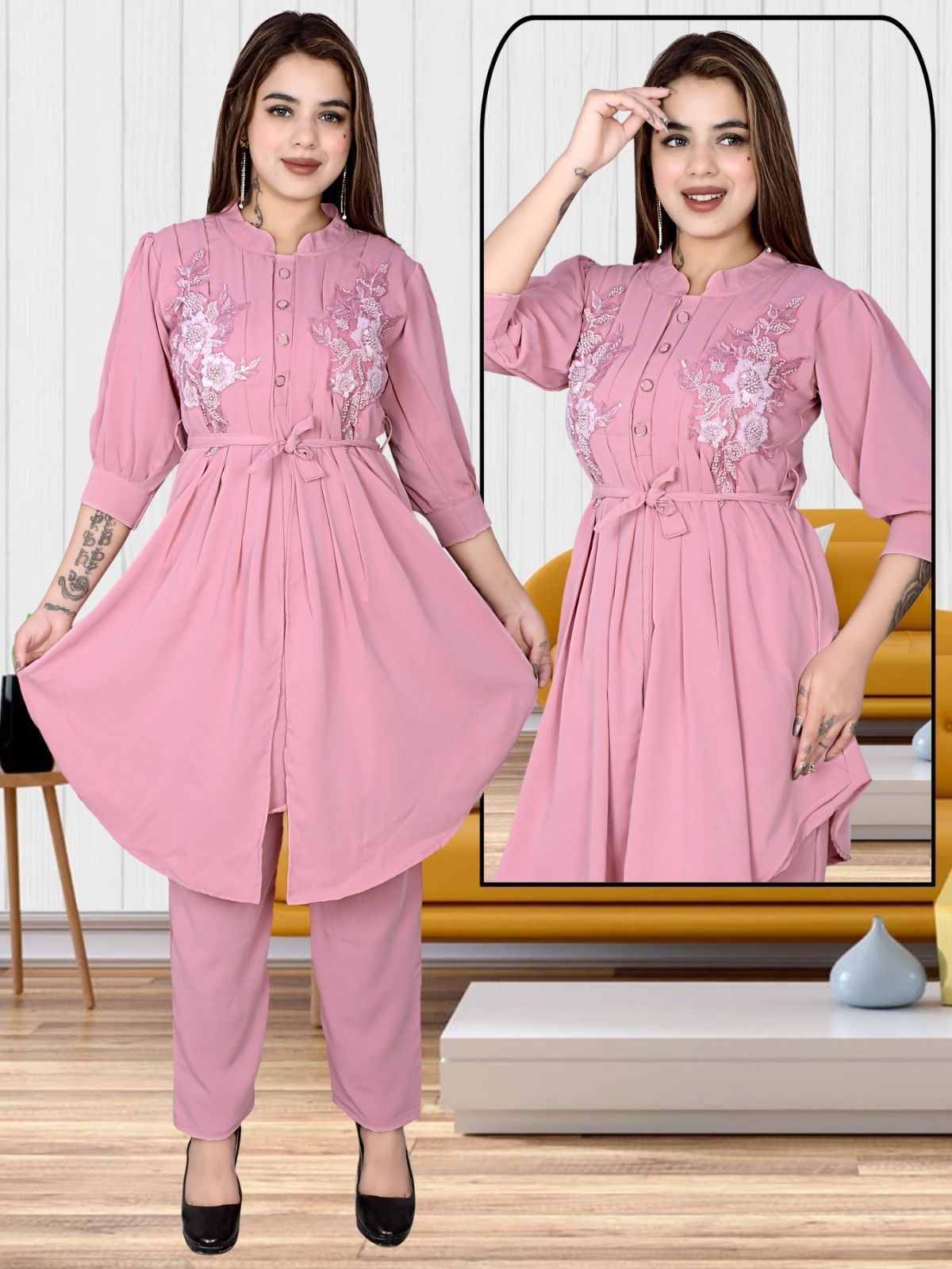 Women’s Pink Embroidered Long Kurti Shirt with Pants Elegant Two-Piece Set of 6 pieces[3 COLOR]