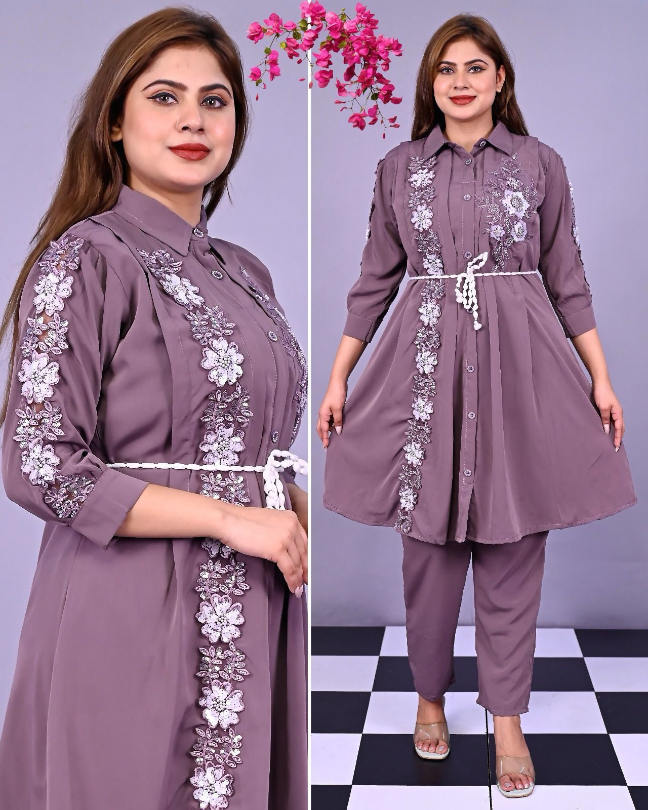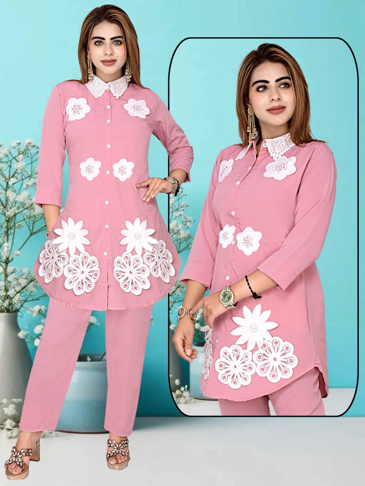Women’s Pink Floral Appliqué Long Shirt with Pants – Elegant Two-Piece Set of 6 pieces[3 COLOR]