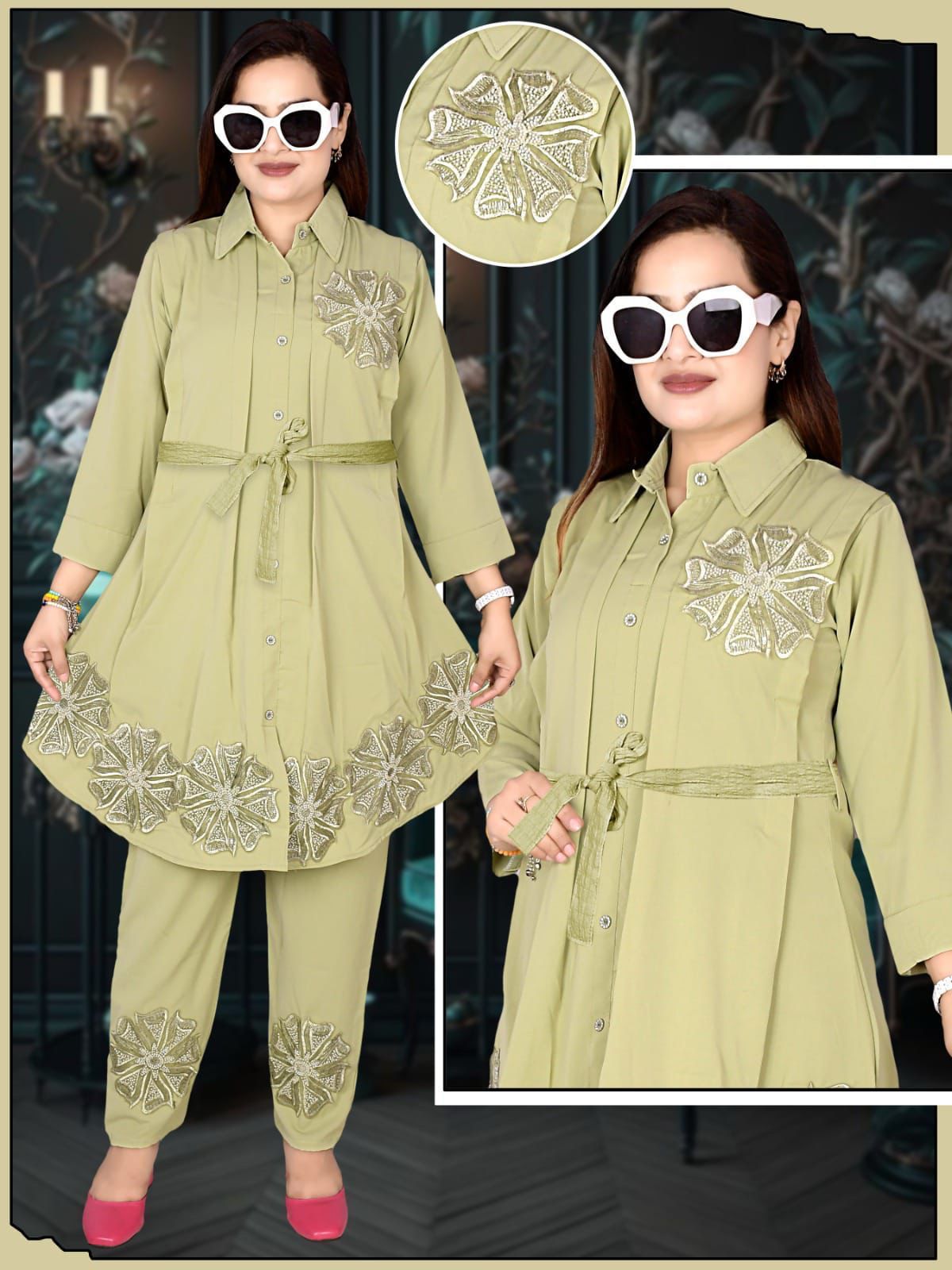 Women’s Light Olive Embroidered Long Shirt with Pants – Stylish Two-Piece Set of 6 pieces[3 COLOR]