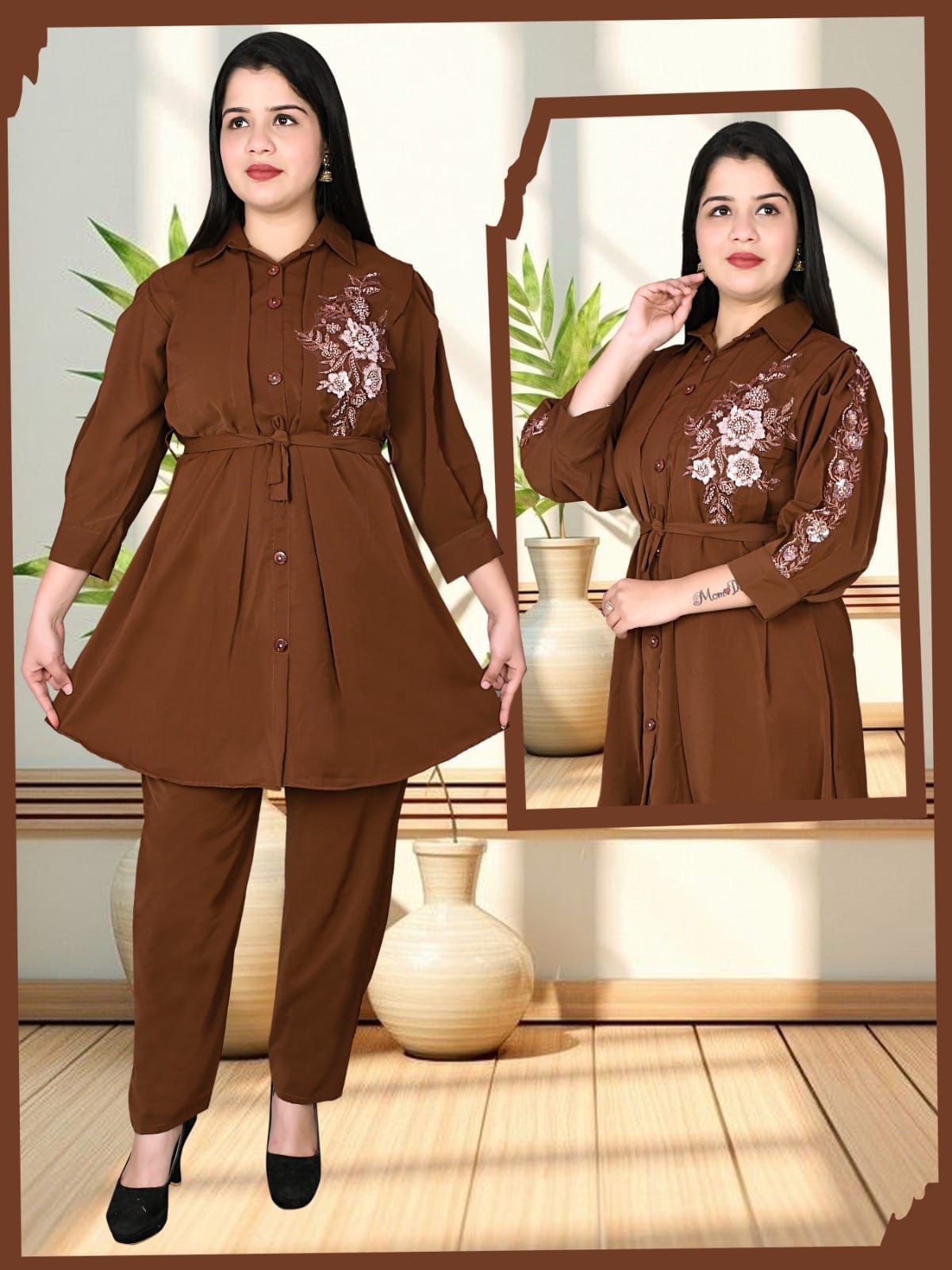 Women’s Brown Embroidered Long Shirt with Pants Set Casual & Elegant Two-Piece Outfit Set of 6 Pieces[3 COLOR]