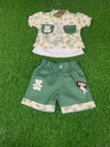 - Description: This charming two-piece outfit is perfect for your little one's casual wear. The set includes a cream-colored, short-sleeved top with a delicate butterfly and floral print. The top features a green flap pocket with the text "SWEET." The coordinating green shorts have a cute teddy bear applique on one leg and a matching "SWEET" patch on the other. The shorts also feature a butterfly print trim and a mock-drawstring detail at the waist.