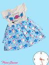 - Design: The dress features a white top with a graphic print including blooming flowers, hands, and the inspirational quote "TRUST YOUR INSTINCTS WATCH YOUR MAGIC GROW". The skirt portion is blue with an all-over print of hearts in various shades of blue, pink, and white. A bow detail is also visible near the neckline.