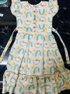 Bring a touch of modern art to your wardrobe with this charming and playful frock. This dress is crafted from a comfortable, textured cream-colored fabric, featuring a unique abstract print in shades of light blue, golden yellow, and white. The design showcases an artistic arrangement of semi-circular and wavy patterns, creating a contemporary and eye-catching look.