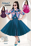 - Description: This elegant two-piece set is the perfect party and occasion wear for young girls. The outfit features a sleeveless teal blue frock with a high neck and a beautifully pleated, flared skirt that gives it a princess-like silhouette. The dress is cinched at the waist with a floral applique and a belt. It is paired with a fashionable, short-sleeved shrug boasting a vibrant floral print in shades of blue, pink, and purple.