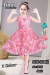 - Description: This beautiful sleeveless frock is a perfect choice for parties, special occasions, and festive events. The dress features a vibrant pink background with a delicate all-over floral print. The bodice has a cinched and pleated design, and the waist is adorned with a decorative floral applique. The skirt is beautifully pleated and flares out, creating a graceful and voluminous silhouette that is perfect for twirling.