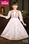 - Description: Off-white ethnic gown for girls with an embroidered bodice featuring floral motifs, a printed hem, and sheer sleeves.