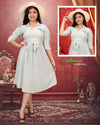 The design features a classic shirt collar paired with a partial button-down front, offering a clean and structured look. The three-quarter puff sleeves with gathered shoulders add a feminine touch, enhancing the dress’s graceful appeal. A small chest patch detail gives it a modern edge, while the knee-length hemline keeps it versatile and wearable. The dress flows effortlessly, providing ease of movement and all-day comfort.