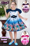 - Description: This beautiful sleeveless frock is an ideal choice for parties and special occasions. The dress features a white bodice with blue polka dots, which transitions into a captivating blue ombre and finishes with a vibrant, multi-colored floral print on the flared skirt. The bodice is embellished with a decorative floral applique at the waist, and the dress is completed with unique, dark blue, shrug-style sleeve accents.