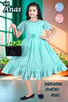 - Description: This charming sleeveless frock is a perfect choice for party wear and special occasions. The dress features a light blue color with a delicate vertical striped pattern. The bodice has short, ruffled sleeves and is cinched at the waist with a floral embellishment, creating a full and flared skirt with a matching ruffled hem. Inset images show other available color variations with different floral prints.